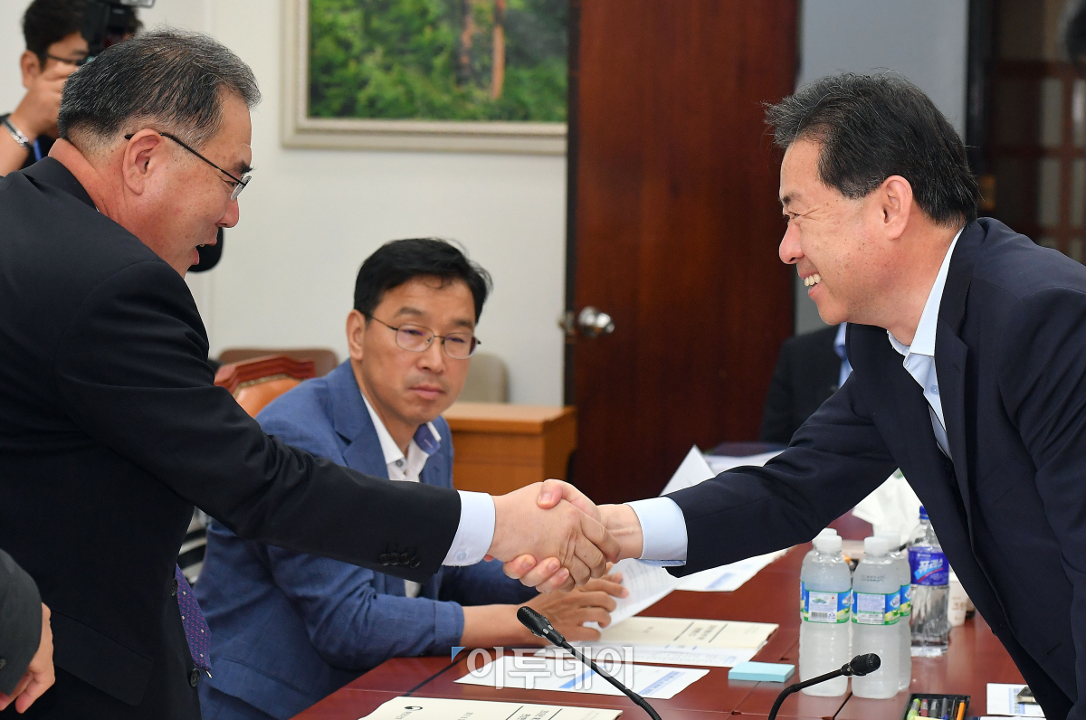 김영춘 해양수산부 장관과 이개호 국회 농림축산식품해양수산위원장 직무대리가 22일 오전 서울 여의도 국회에서 열린 2018년 해양수산부 소관 예산관련 당정협의회에서 악수하고 있다.이동근 기자 foto@
