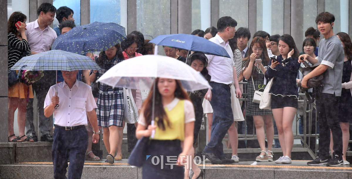절기상 처서인 23일 오전 서울 여의도 국회의사당역 출구에서 우산을 준비하지 못한 시민들이 비가 그치길 기다리고 있다. 기상청은 이날부터 24일까지 서울, 경기, 강원영서, 서해5도에 50~150mm, 많은 곳은 200mm의 비가 내릴 것으로 예보했다. 이동근 기자 foto@