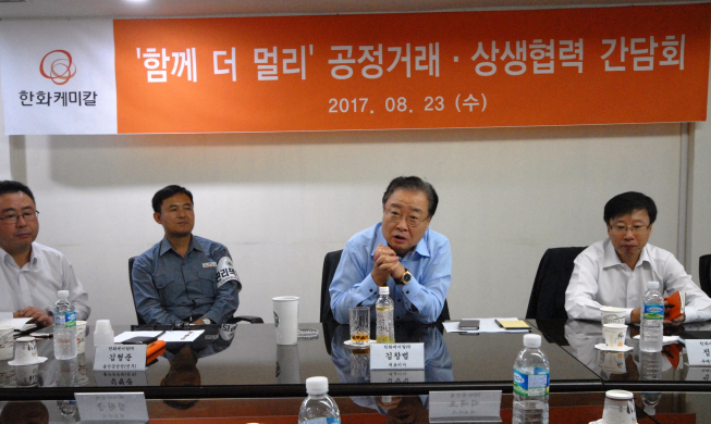 한화케미칼이 23일 울산공장에서 울산 지역 10개 협력업체 대표이사를 초청해 공정거래·상생협력 간담회를 개최했다. 김창범 한화케미칼 사장(왼쪽부터 세 번째)이 간담회에서 지난 5월 출범한 공정거래 및 상생협력 강화위원회(공생위)의 취지와 상생협력 실천을 위한 제도 운영 방안에 대해 직접 설명하고 있다. 공생위는 불공정 거래 근절과 상생 협력을 강화하기 위해 출범한 조직이다. (사진제공=한화케미칼)