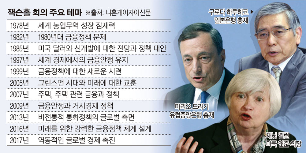 특히 올해는 재닛 옐런 미국 연방준비제도(Fedㆍ연준) 의장과 마리오 드라기 유럽중앙은행(ECB) 총재, 구로다 하루히코 일본은행(BOJ) 총재 등이 모처럼 총출동해 더욱 시장의 관심이 더욱 쏠리고 있다.