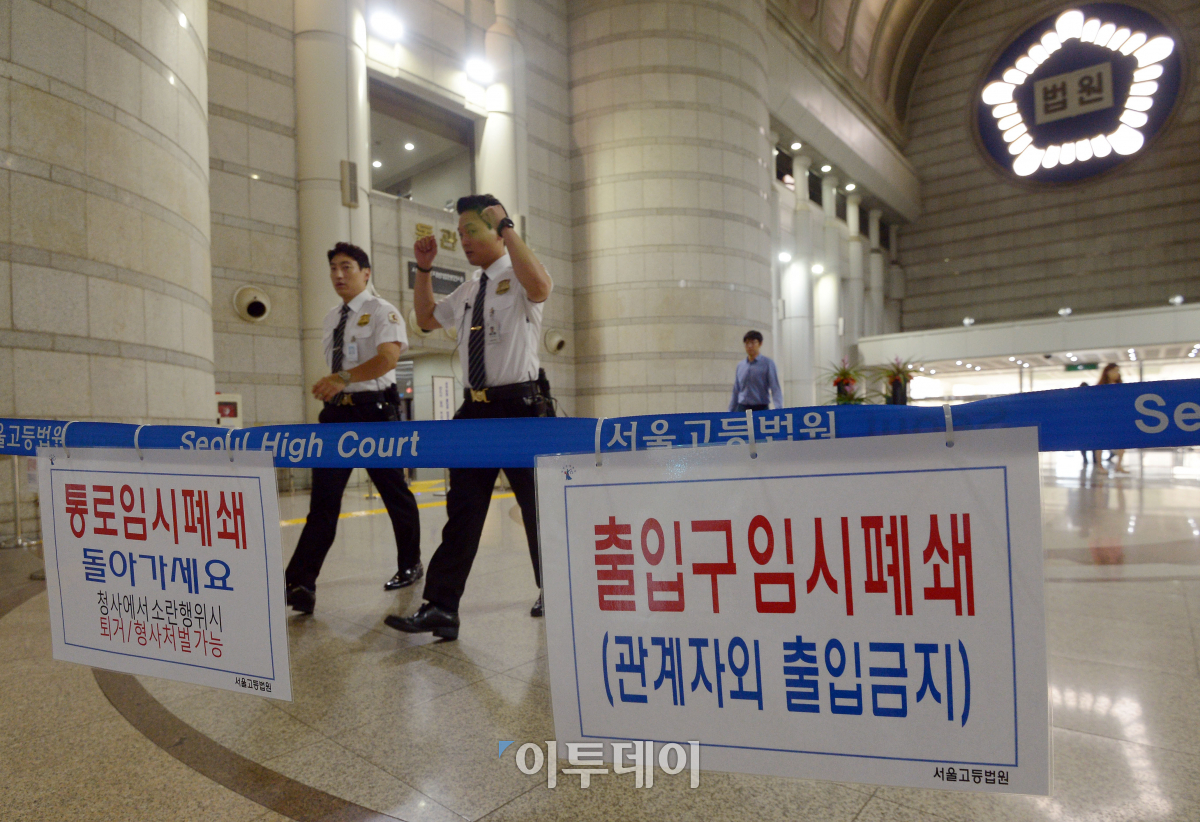 '세기의 재판'으로 불리는 이재용 삼성전자 부회장에 1심 선고공판일인 25일 서울 서초구 서울중앙지법 내 통로 일부가 폐쇄되는 등 청사 내부에 긴장감이 흐르고 있다. 이 부회장 1심 선고공판은 이날 오후 2시 30분 417호 대법정에서 열린다. 이동근 기자 foto@