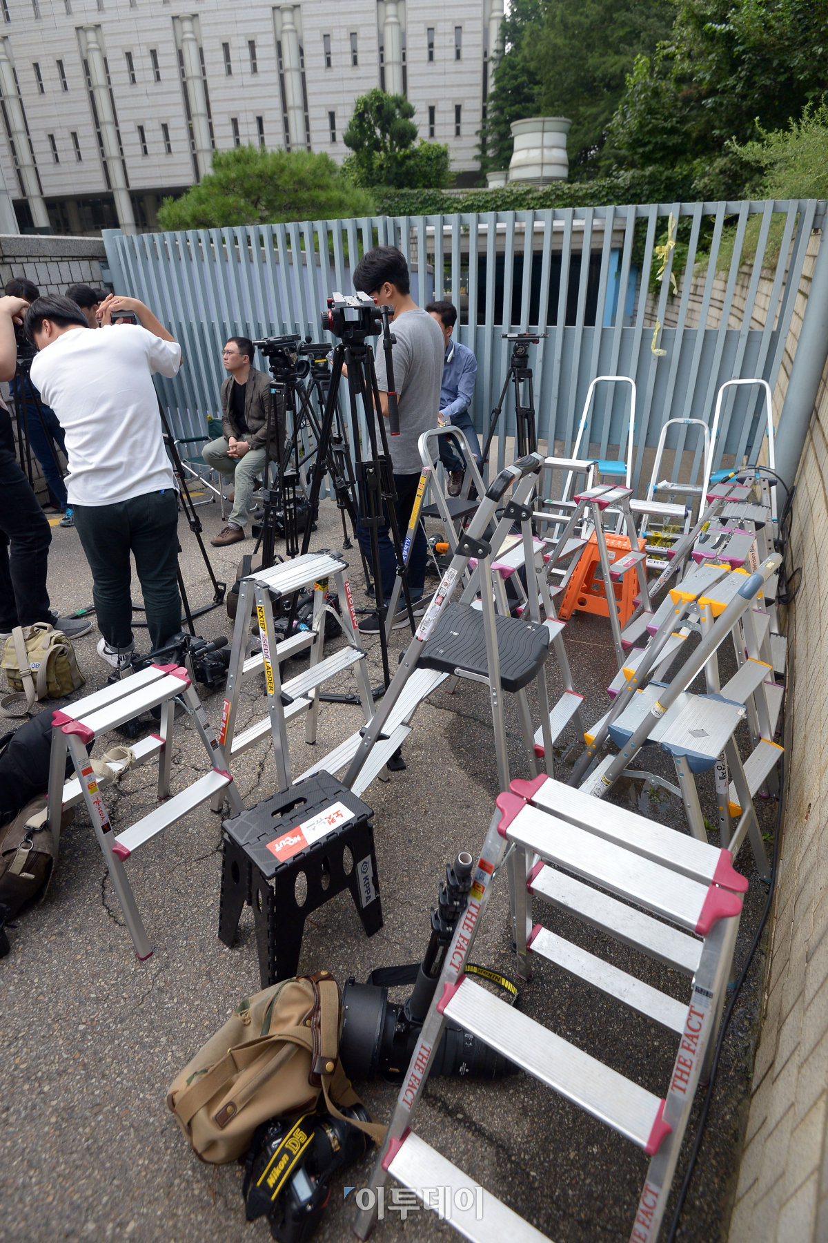'세기의 재판'으로 불리는 이재용 삼성전자 부회장에 1심 선고공판일인 25일 서울 서초구 서울중앙지법 구치감 앞에 취재진의 장비들이 놓여있다. 이 부회장 재판은 이날 오후 2시 30분 417호 대법정에서 열린다. 이동근 기자 foto@