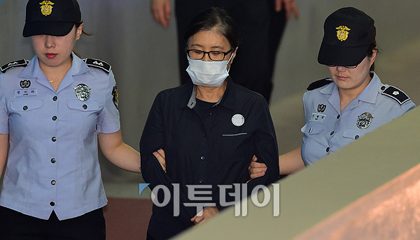 최순실 씨가 25일 서울 서초동 서울중앙지법에서 열린 공판에 출석하기 위해 호송차에서 내려 법정으로 향하고 있다. 이동근 기자 foto@