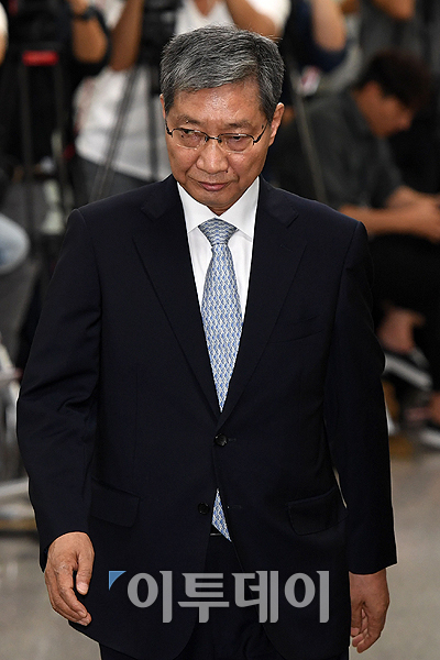 장충기 전 삼성그룹 미래전략실 차장이 25일 서울중앙지법에서 열린 1심 선고 공판에 출석하고 있다. 이동근 기자 foto@