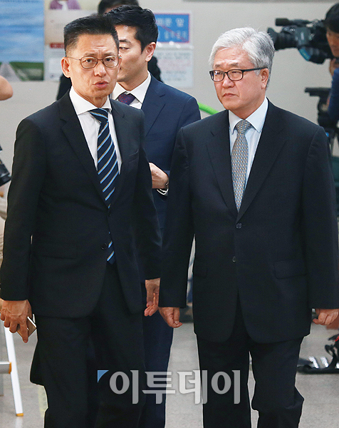 황성수 전 삼성전자 전무(왼쪽)와 박상진 전 삼성전자 사장이 25일 1심 선고 공판을 마친 뒤 서울중앙지법을 나서고 있다. 이동근 기자 foto@