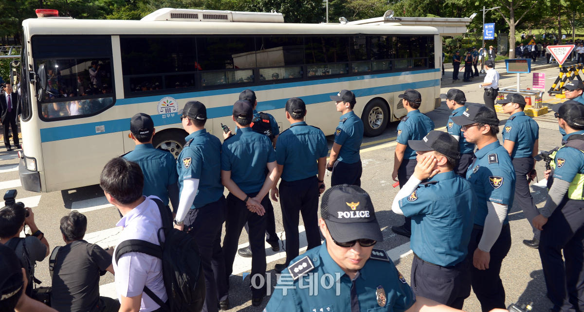 이재용 삼성전자 부회장이 탄 호송차량이 25일 서울 서초구 서울중앙지법을 빠져나가고 있다. 법원은 이날 이재용 부회장에게 징역 5년의 실형을 선고했다. 이동근 기자 foto@