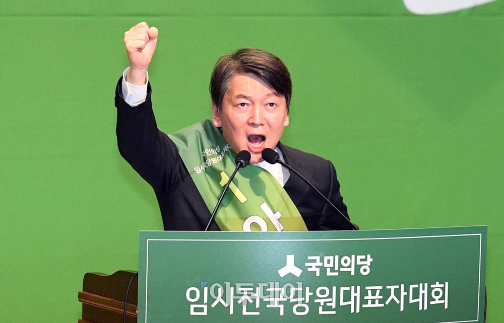 국민의당 안철수 새 대표가 27일 오후 국회 의원회관 대회의실에서 열린 전당대회에서 대표로 선출된 뒤 인사말을 하고 있다. 최유진 기자 strongman55@