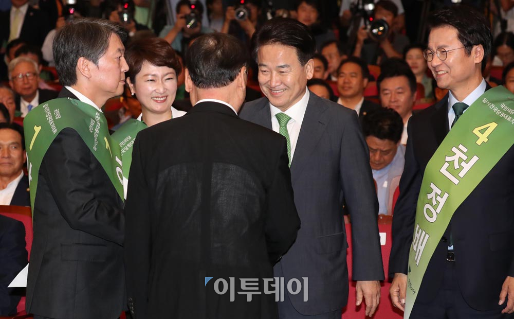 안철수 새 국민의당 대표가 27일 오후 국회 의원회관 대회의실에서 열린 전당대회에서 개표결과가 발표되자 자리에서 일어서 경쟁 후보들에게 인사하고 있다. 최유진 기자 strongman55@
