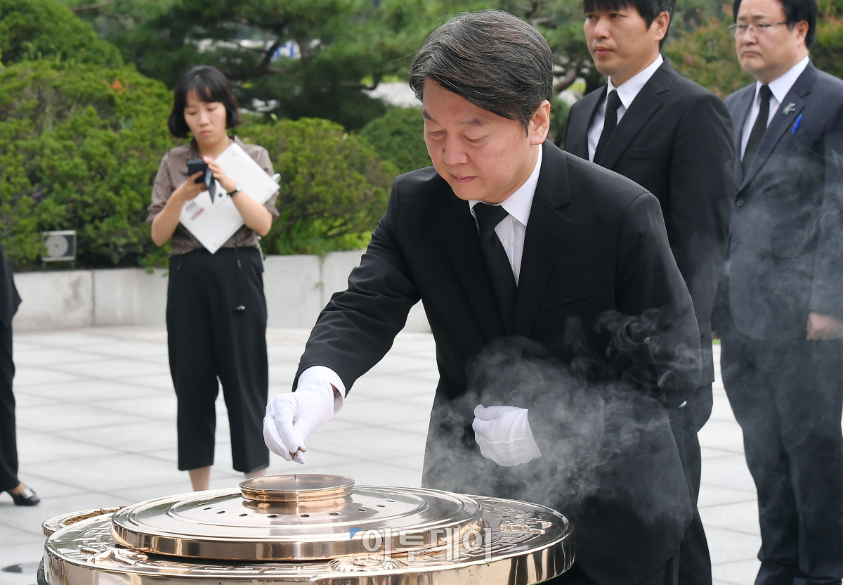 안철수 국민의당 신임 당대표가 28일 오전 서울 동작구 국립서울현충원을 찾아 현충탑에 분향하고 있다. 이동근 기자 foto@