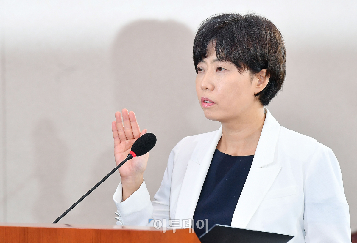 이유정 헌법재판관 후보자가 28일 서울 여의도 국회에서 열린 인사청문회에서 선서를 하고 있다. 이동근 기자 foto@