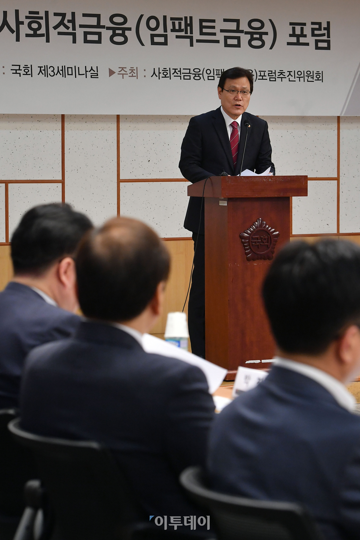최종구 금융위원장이 28일 서울 여의도 국회에서 열린 '국회와 함께하는 사회적금융(임팩트금융) 포럼' 발족식에서 축사를 하고 있다. 이동근 기자 foto@