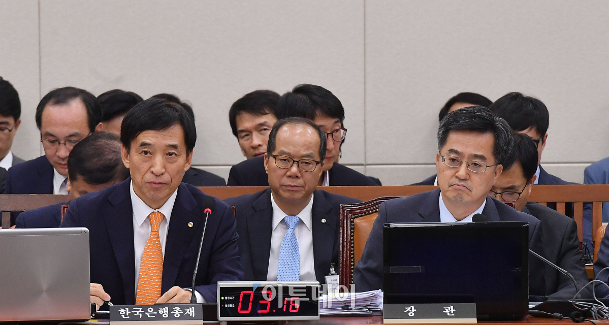 김동연 경제부총리 겸 기획재정부 장관(오른쪽)과 이주열 한국은행 총재가 28일 서울 여의도 국회에서 열린 기획재정위 전체회의에서 국민의당 김성식 의원의 질의를 듣고 있다. 이동근 기자 foto@