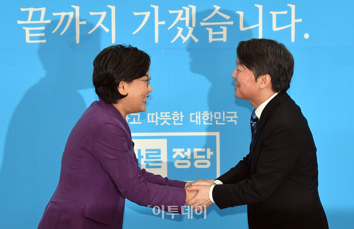 국민의당 안철수 대표(오른쪽)가 28일 서울 여의도 국회 바른정당 당대표실을 방문해 이혜훈 대표와 악수하고 있다. 이동근 기자 foto@