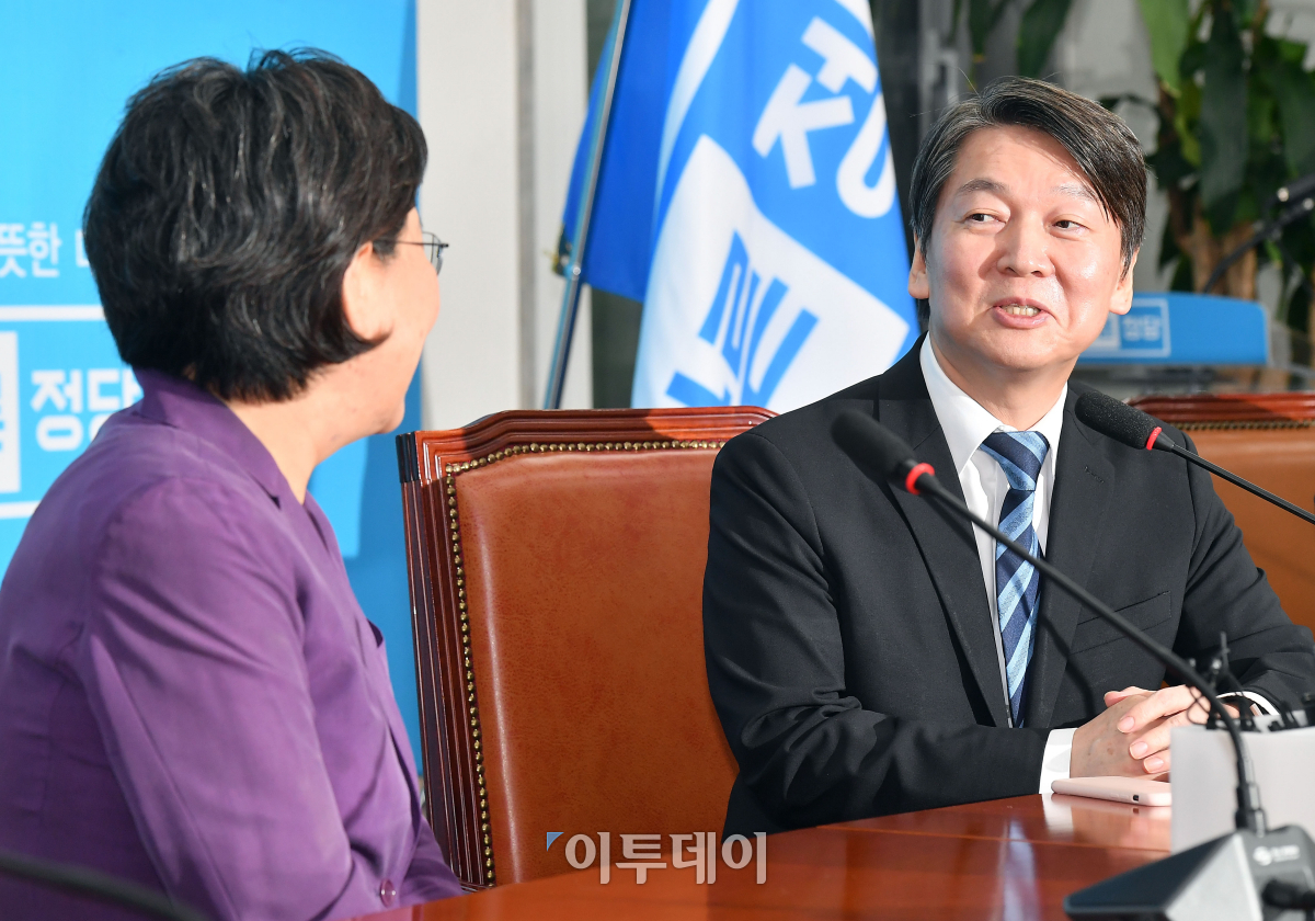국민의당 안철수 대표(오른쪽)가 28일 서울 여의도 국회 바른정당 당대표실을 방문해 이혜훈 대표와 대화하고 있다. 이동근 기자 foto@