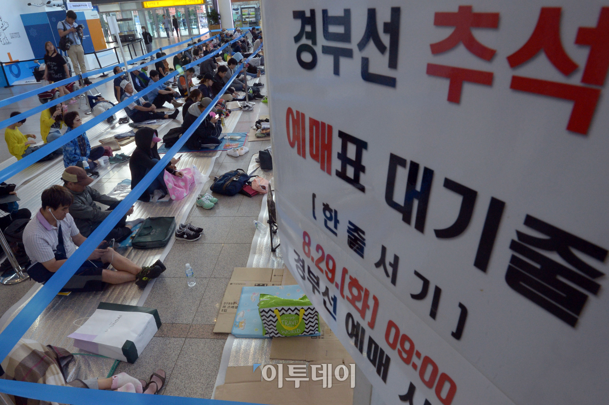 추석 열차승차권 예매일인 29일 오전 서울 용산구 서울역 매표소 앞에 승차권을 구입하려는 시민들이 예매를 기다리고 있다. 올해 추석 열차승차권은 30일까지 홈페이지(www.letskorail.com)와 지정된 역 창구, 승차권 판매 대리점에서 예매할 수 있다. 29일은 경부·경전·동해·충북선, 30일에는 호남·전라·장항·중앙선 등의 승차권을 판매한다. 이동근 기자 foto@