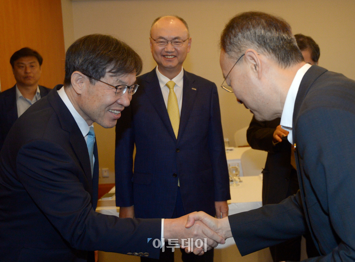 백운규 산업통상자원부 장관(오른쪽)과 권오준 포스코 회장이 30일 오전 서울 소공동 롯데호텔에서 열린 철강업계 상생협력 간담회에서 악수하고 있다. 이동근 기자 foto@