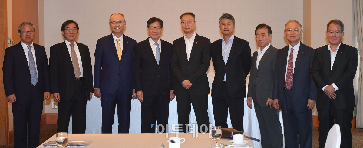백운규 산업통상자원부 장관(가운데)이 30일 오전 서울 소공동 롯데호텔에서 열린 철강업계 상생협력 간담회에서 참석자들과 기념촬영을 하고 있다. 왼쪽부터 송재빈 철강협회 부회장, 김창수 동부제철 사장, 우유철 현대제철 부회장, 권오준 포스코 회장, 백 장관, 장세욱 동국제강 부회장, 이순형 세아제강 회장, 손봉락 TCC동양 회장, 이태준 고려제강 사장. 이동근 기자 foto@