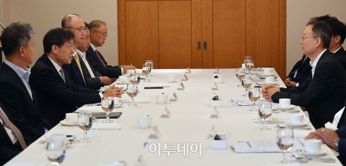 권오준 포스코 회장(왼쪽에서 두 번째)이 30일 오전 서울 소공동 롯데호텔에서 열린 철강업계 상생협력 간담회에서 인사말을 하고 있다. 이동근 기자 foto@