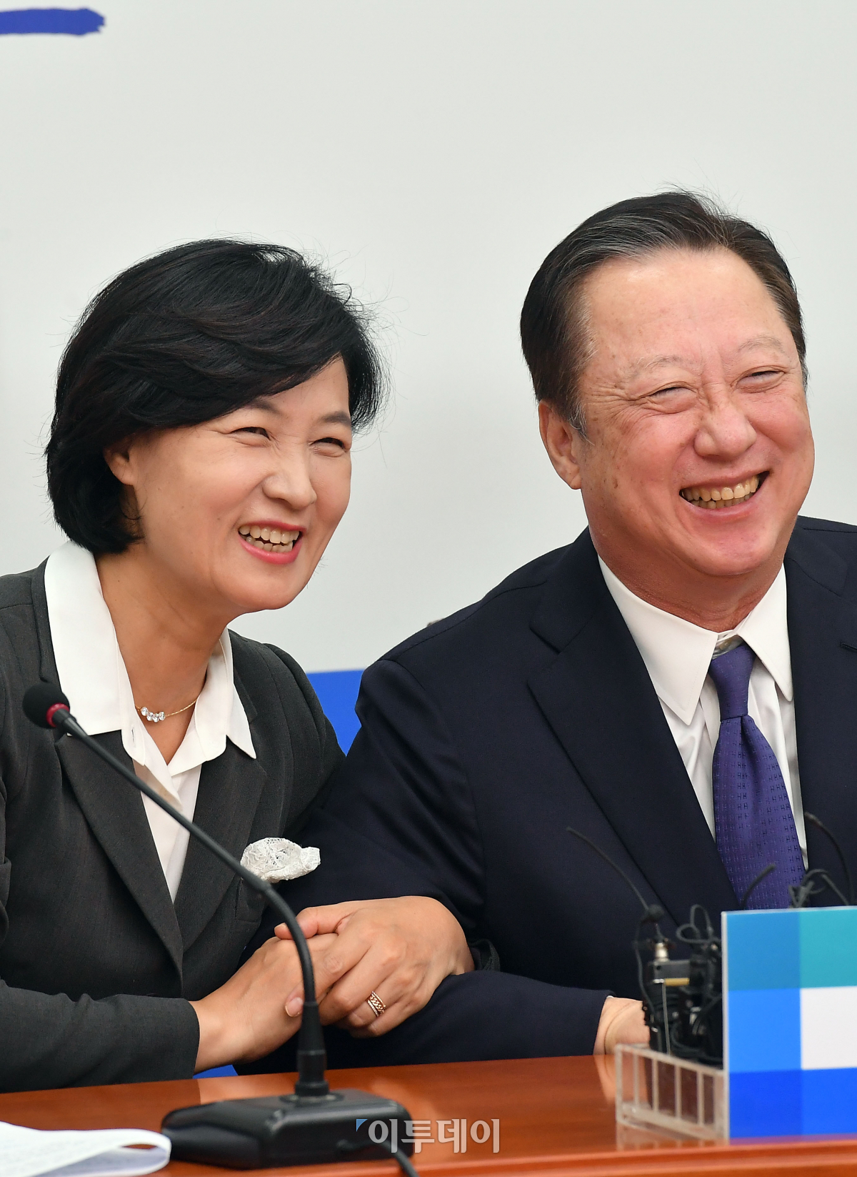 더불어민주당 추미애 대표(왼쪽)가 30일 서울 여의도 국회 당 대표실을 방문한 박용만 대한상공회의소 회장과 만나 트레이드마크가 된 팔짱을 끼고 있다. 이동근 기자 foto@