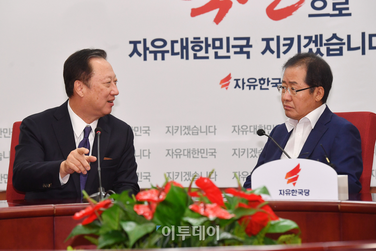 박용만 대한상공회의소 회장(왼쪽)이 30일 서울 여의도 자유한국당사를 방문해 홍준표 대표와 대화하고 있다. 이동근 기자 foto@