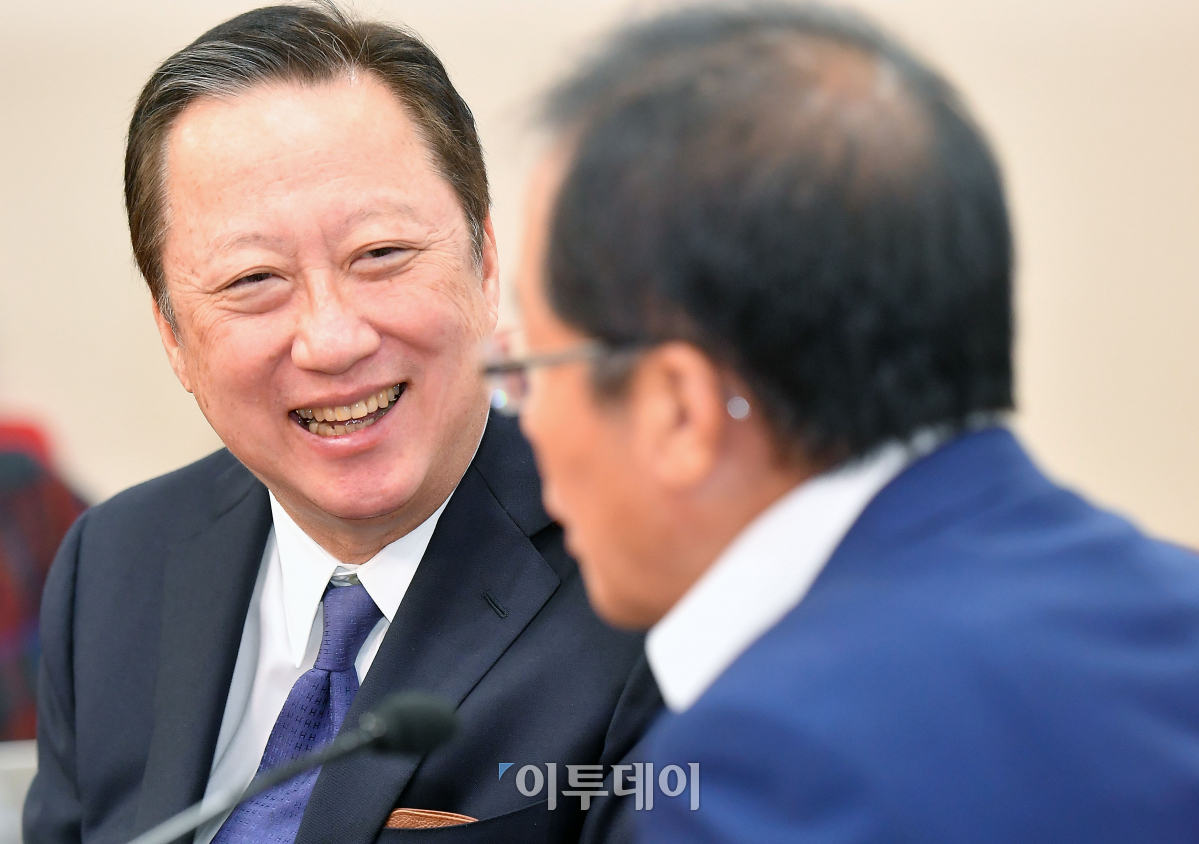 박용만 대한상공회의소 회장(왼쪽)이 30일 서울 여의도 자유한국당사를 방문해 홍준표 대표와 대화하고 있다. 이동근 기자 foto@
