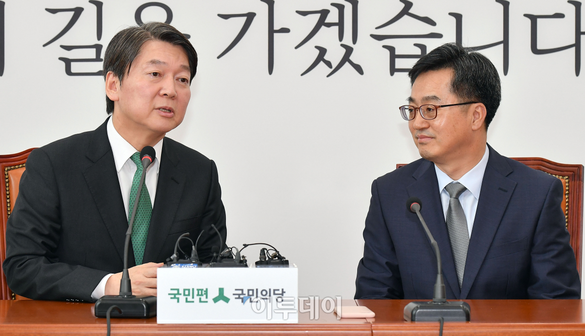 국민의당 안철수 대표(왼쪽)가 31일 서울 여의도 국회 대표실을 방문한 김동연 경제부총리 겸 기획재정부 장관과 대화하고 있다. 이동근 기자 foto@