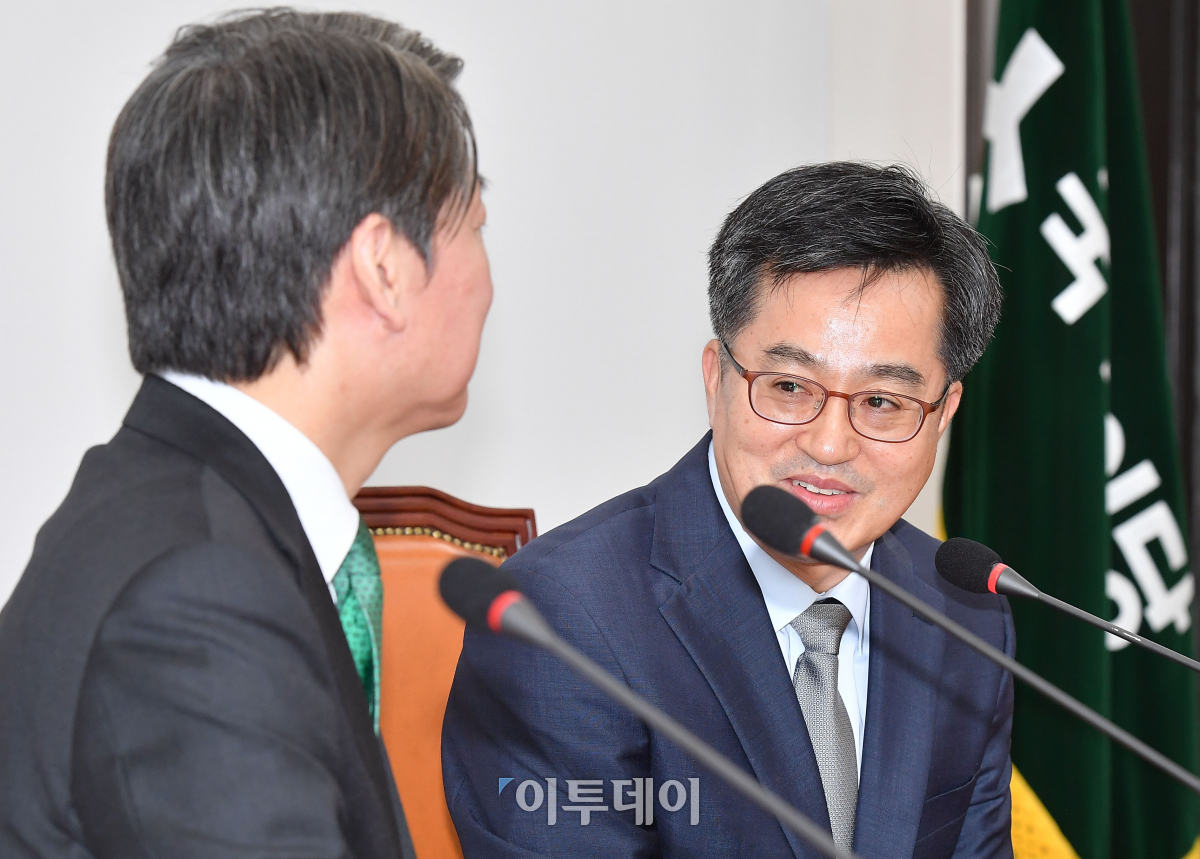 김동연 경제부총리 겸 기획재정부 장관(오른쪽)이 31일 서울 여의도 국회 국민의당 대표실을 방문해 안철수 대표와 대화하고 있다. 이동근 기자 foto@