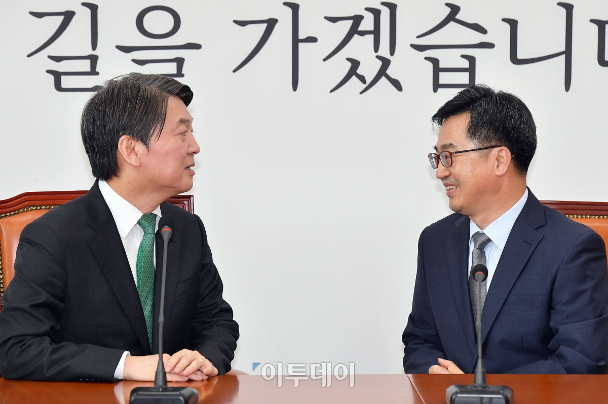김동연 경제부총리 겸 기획재정부 장관이 31일 서울 여의도 국회 국민의당 대표실을 방문해 안철수 대표와 대화하고 있다. 이동근 기자 foto@