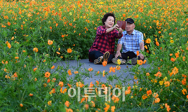 완연한 가을 날씨를 보인 31일 경기 광명시 안양천에서 시민들이 만개한 황화 코스모스를 보며 가을의 정취를 즐기고 있다. 고이란 기자 photoeran@