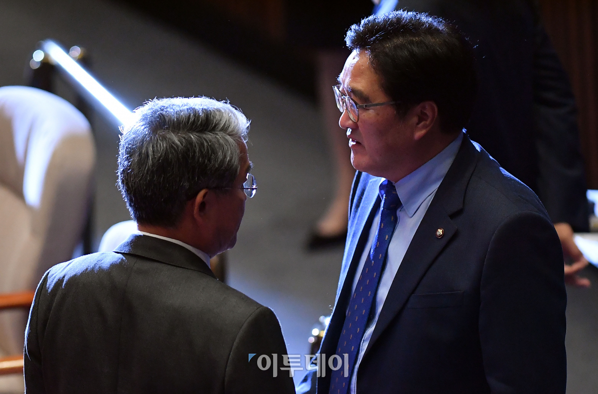 더불어민주당 우원식 원내대표(오른쪽)와 국민의당 김동철 원내대표가 1일 서울 여의도 국회 본회의장에서 열린 제354회 정기국회 개회식에서 대화하고 있다. 이동근 기자 foto@