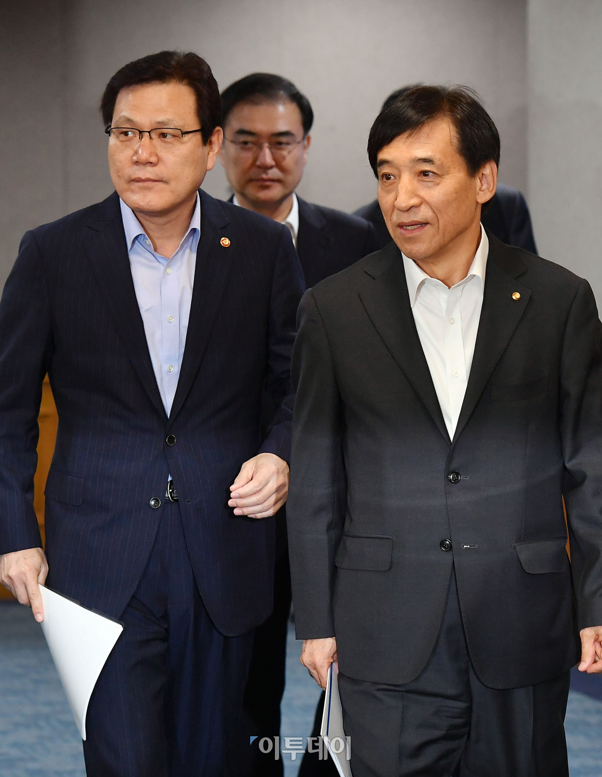 최종구 금융위원장(왼쪽)과 이주열 한국은행 총재가 4일 오전 서울 중구 은행회관에서 열린 거시경제금융회의에 참석하기 위해 입장하고 있다. 이동근 기자 foto@