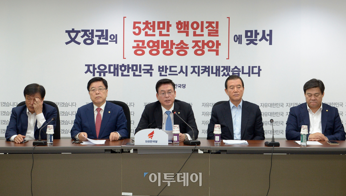 정우택 자유한국당 원내대표(가운데)가 5일 오전 서울 여의도 국회에서 열린 원내대책회의에서 모두발언을 하고 있다. 이동근 기자 foto@