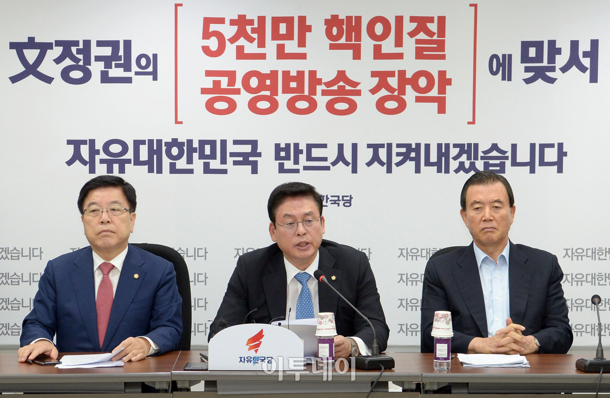 정우택 자유한국당 원내대표(가운데)가 5일 오전 서울 여의도 국회에서 열린 원내대책회의에서 모두발언을 하고 있다. 이동근 기자 foto@
