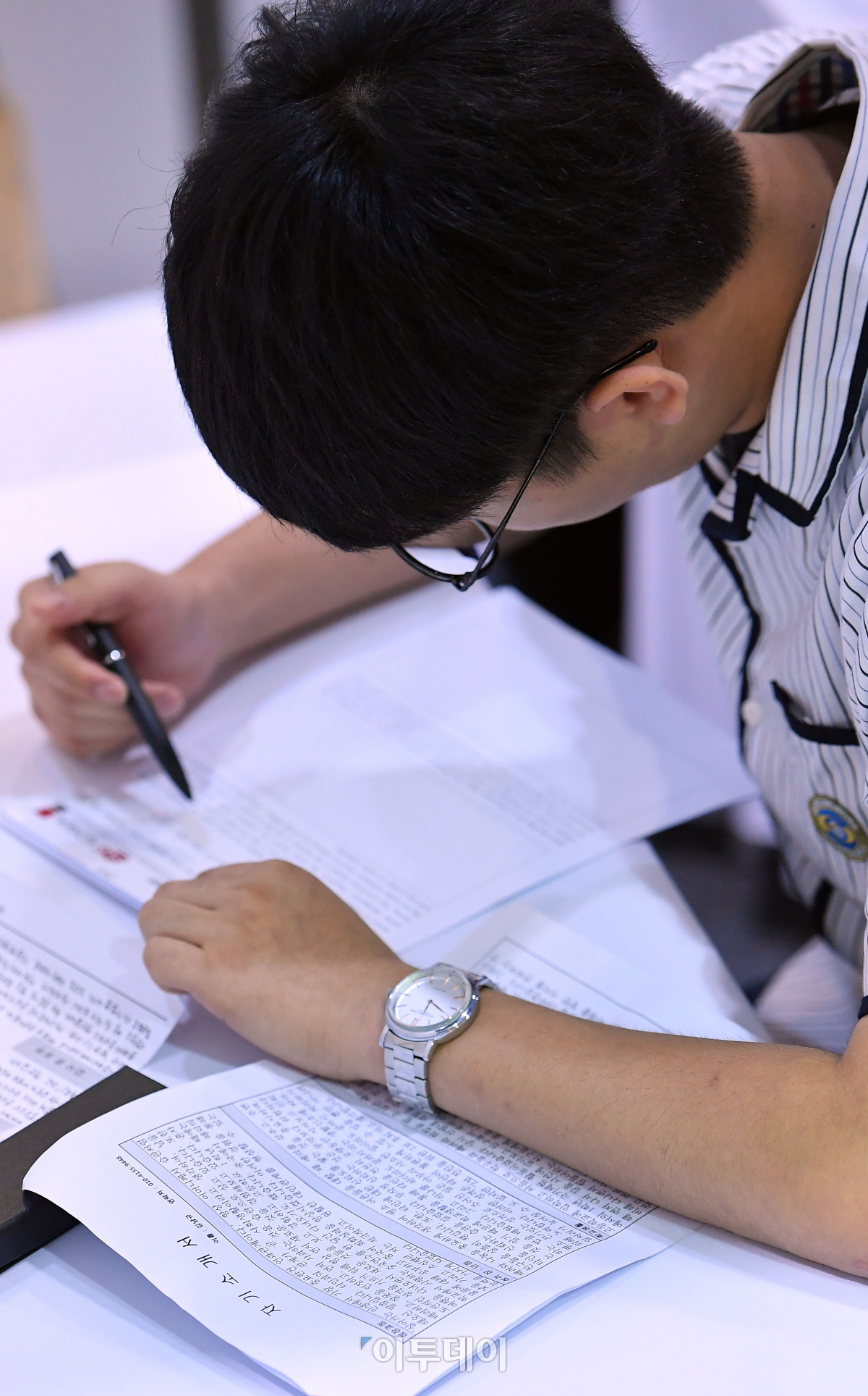 2017 물류산업 청년 채용박람회가 5일 서울 서초구 aT센터에서 열린 가운데 한 학생이 자기소개서를 작성하고 있다. '물류산업이 청년의 미래를 만듭니다'를 주제로 열린 이번 박람회는 현대상선·한진·KCTC 등 물류관련기업과 공공기관 60여개 업체가 참여하며, 21개 기업이 현장에서 채용면접을 진행한다. 이동근 기자 foto@