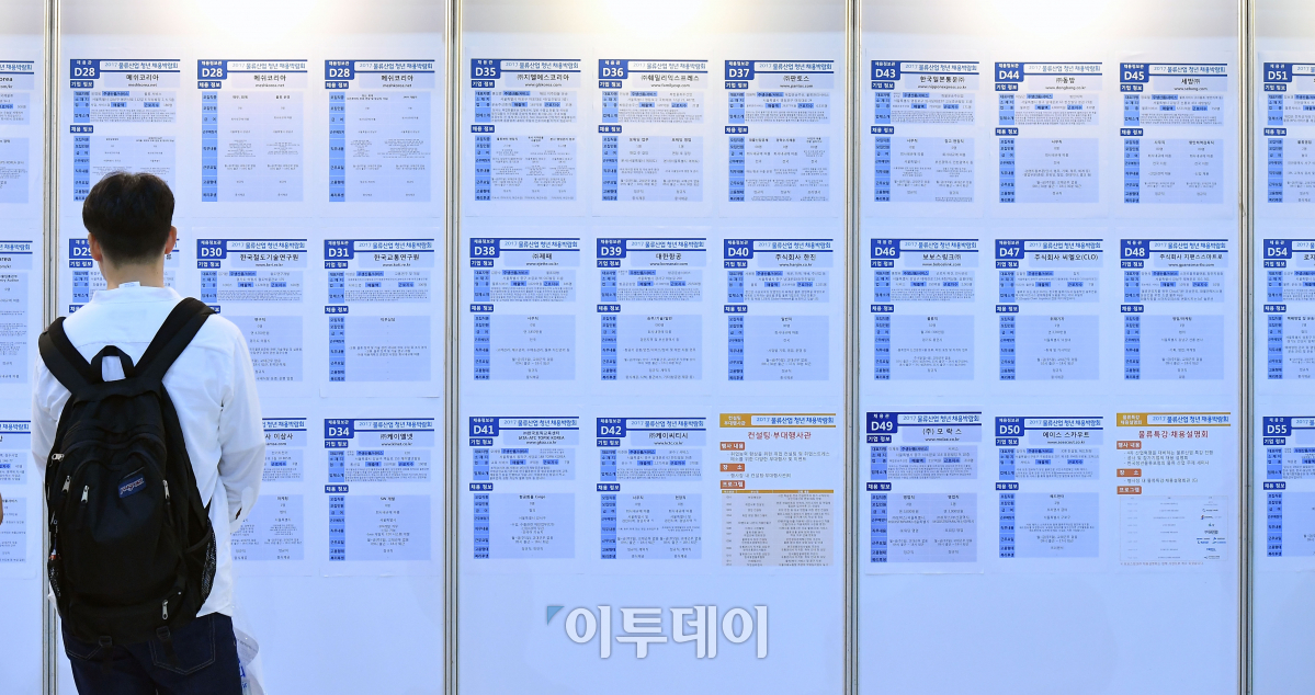 2017 물류산업 청년 채용박람회가 5일 서울 서초구 aT센터에서 열린 가운데 구직자가 채용게시판을 살펴보고 있다. '물류산업이 청년의 미래를 만듭니다'를 주제로 열린 이번 박람회는 현대상선·한진·KCTC 등 물류관련기업과 공공기관 60여개 업체가 참여하며, 21개 기업이 현장에서 채용면접을 진행한다. 이동근 기자 foto@