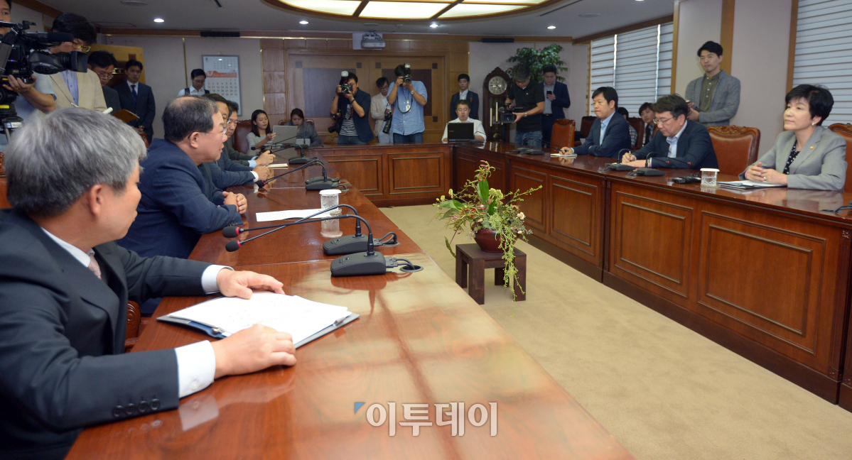 한국경영자총협회 박병원 회장(왼쪽에서 두 번째)이 5일 서울 마포구 경총회관을 방문한 김영주 고용노동부 장관과 대화하고 있다. 이동근 기자 foto@