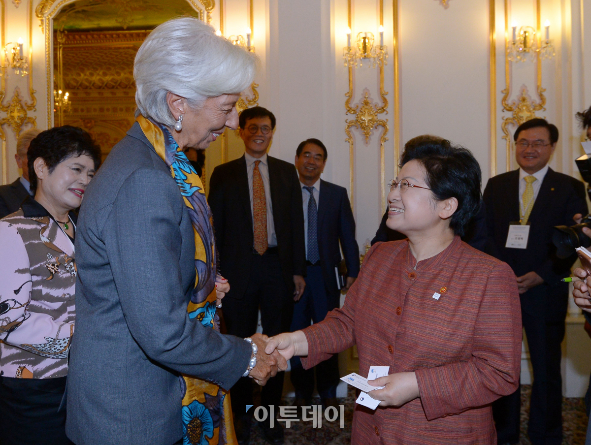 크리스틴 라가르드 IMF 총재(왼쪽)와 정현백 여성가족부 장관이 6일 오전 서울 소공동 롯데호텔에서 열린 2017 대한민국 여성 금융인 국제 콘퍼런스에서 악수를 하고 있다. 이동근 기자 foto@