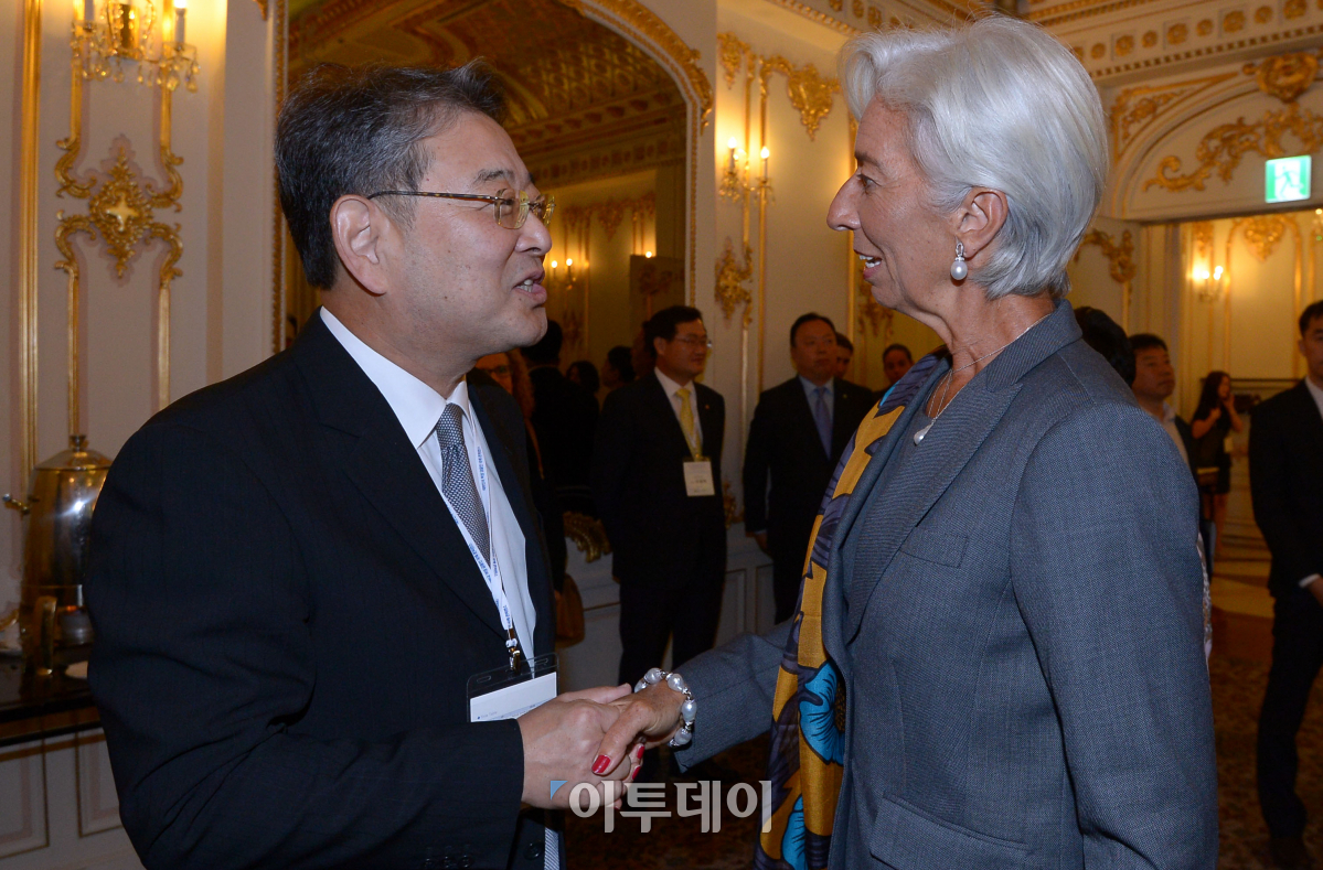 길정우 이투데이 대표(왼쪽)와 크리스틴 라가르드 IMF 총재가 6일 오전 서울 소공동 롯데호텔에서 열린 2017 대한민국 여성 금융인 국제 콘퍼런스에서 악수를 하고 있다. 이동근 기자 foto@