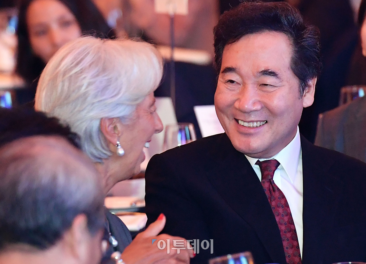 이낙연 국무총리(오른쪽)가 6일 오전 서울 소공동 롯데호텔에서 열린 2017 대한민국 여성 금융인 국제 콘퍼런스에서 크리스틴 라가르드 IMF총재와 대화하며 밝게 웃고 있다. 이동근 기자 foto@
