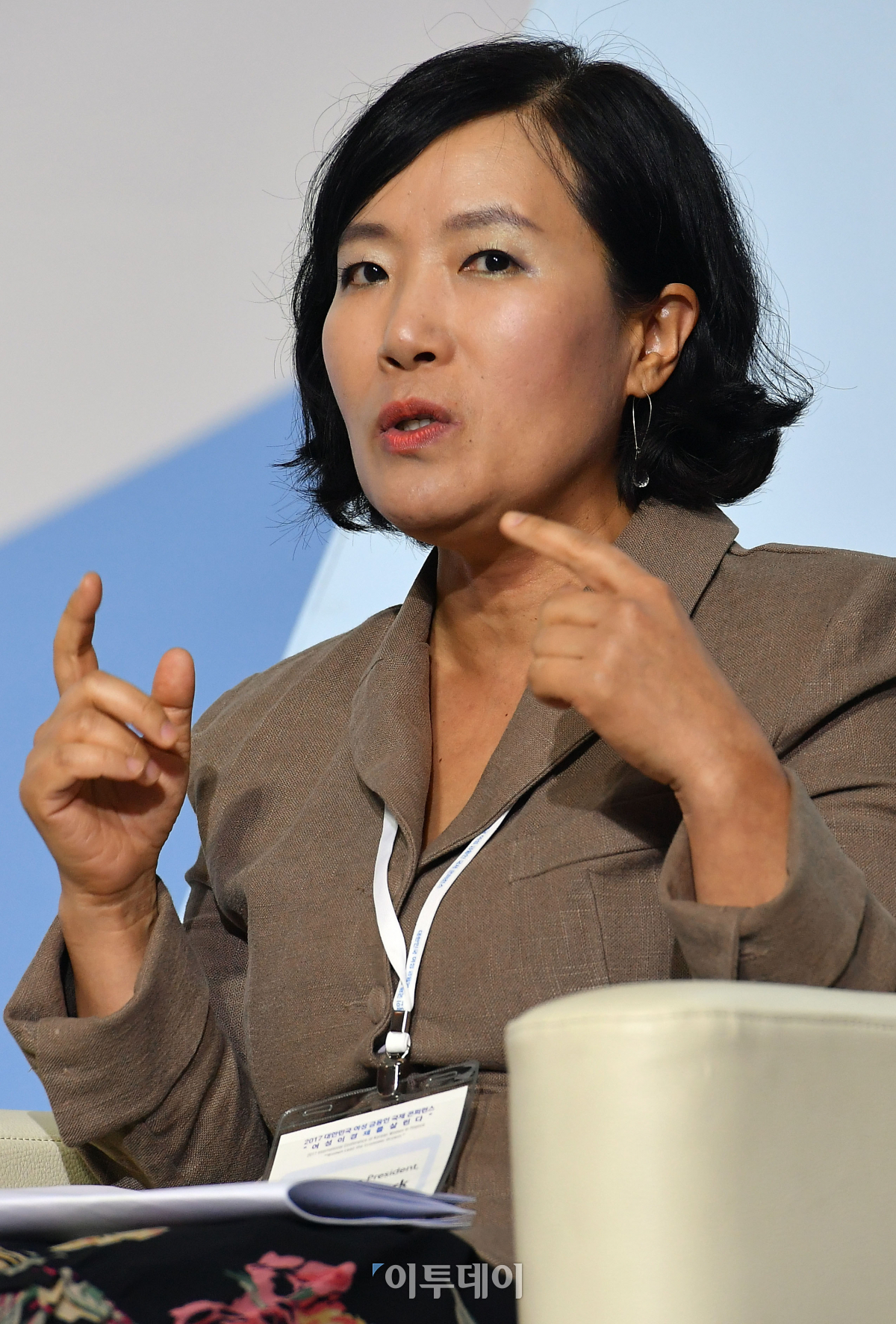 박정림 KB금융지주 부사장이 6일 오전 서울 소공동 롯데호텔에서 열린 2017 대한민국 여성 금융인 국제 콘퍼런스에서 패널토론에 참석해 발언하고 있다. 이동근 기자 foto@