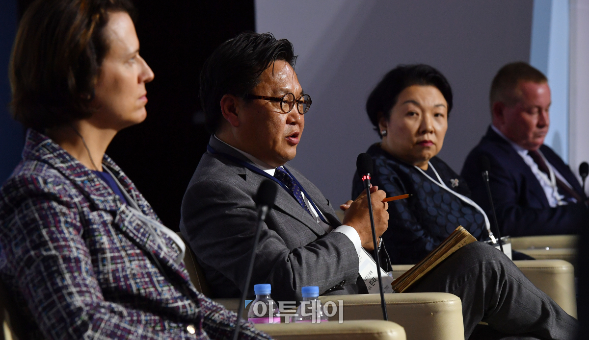 존 리 메리츠자산운용대표(왼쪽에서 두 번째)가 6일 오전 서울 소공동 롯데호텔에서 열린 2017 대한민국 여성 금융인 국제 콘퍼런스에서 패널토론에 참석해 발언하고 있다. 이동근 기자 foto@