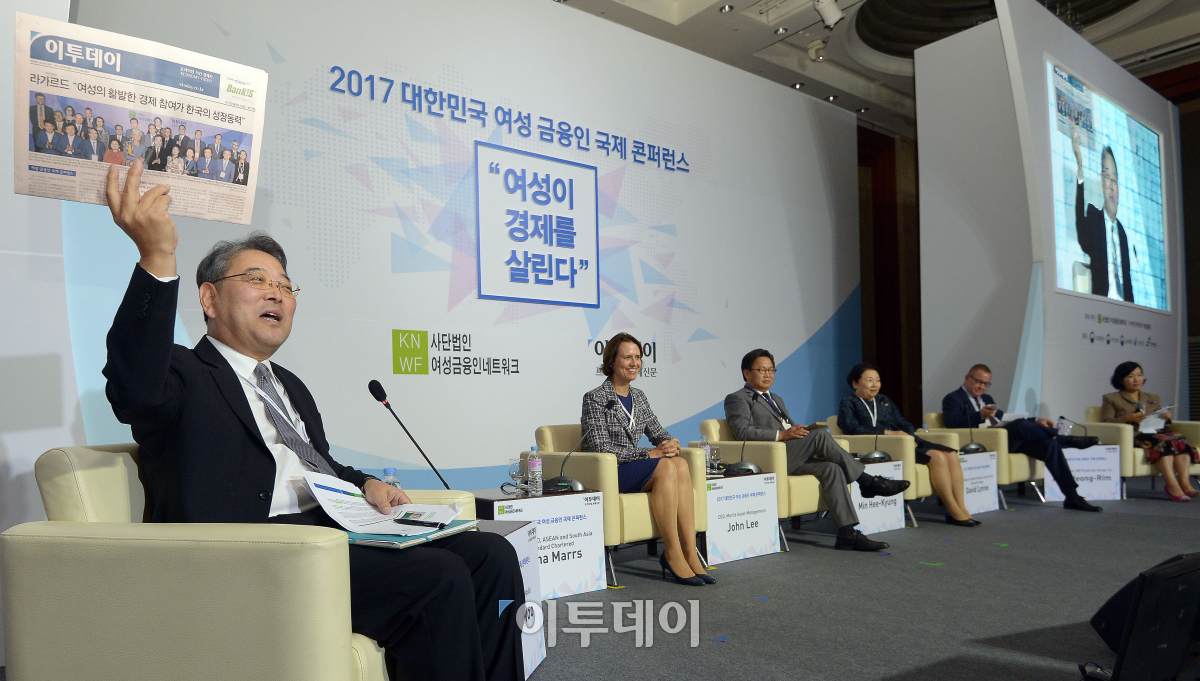 이투데이 길정우 대표가 6일 오전 서울 소공동 롯데호텔에서 열린 2017 대한민국 여성 금융인 국제 콘퍼런스에서 패널토론 사회를 보고있다. 이동근 기자 foto@