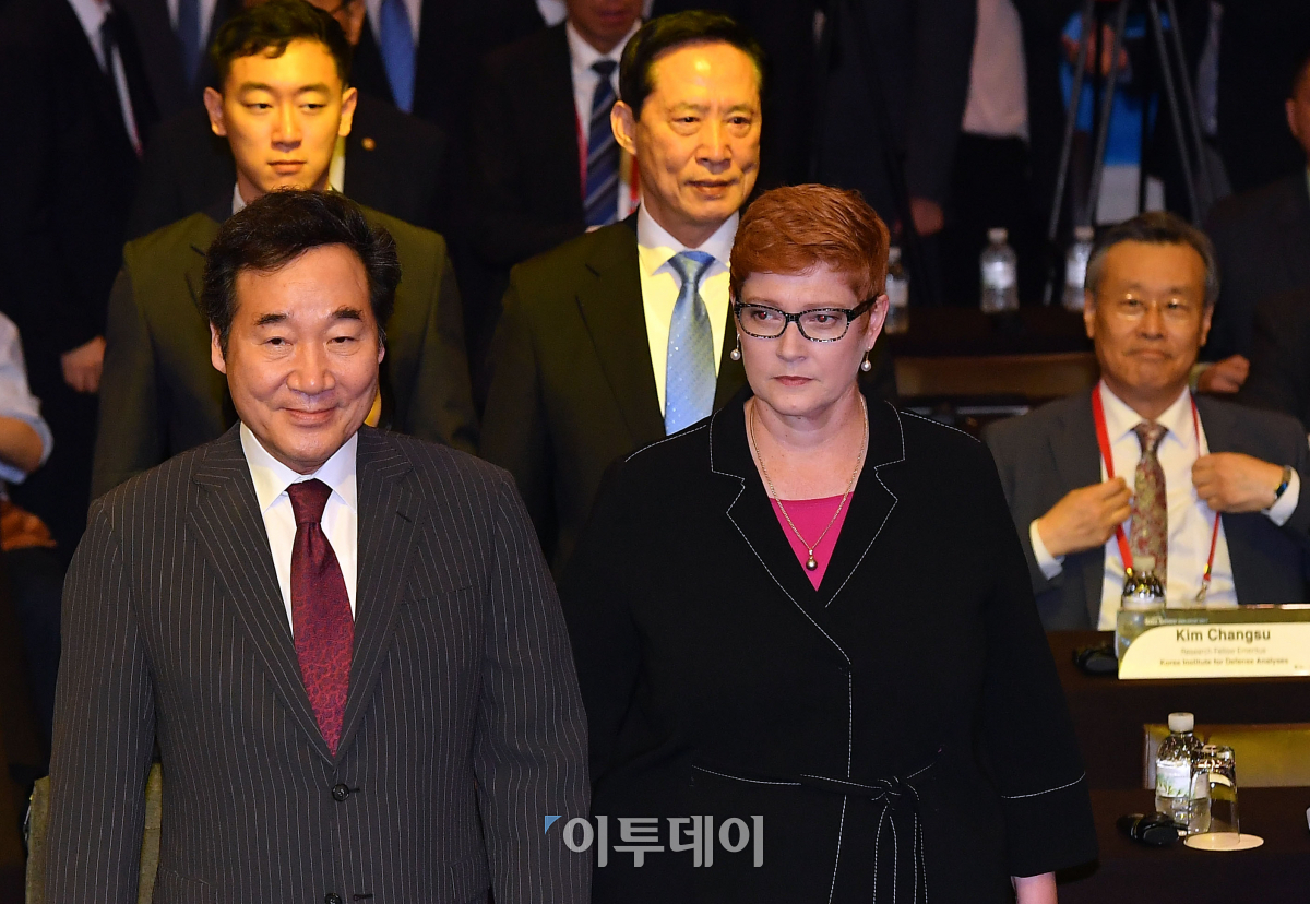 이낙연 국무총리(왼쪽)와 마리스 페인 호주 국방장관, 송영무 국방부 장관(뒷줄 오른쪽)이 7일 오전 서울 중구 웨스틴조선호텔에서 열린 2017서울안보대화에 참석하기 위해 입장하고 있다. 이동근 기자 foto@