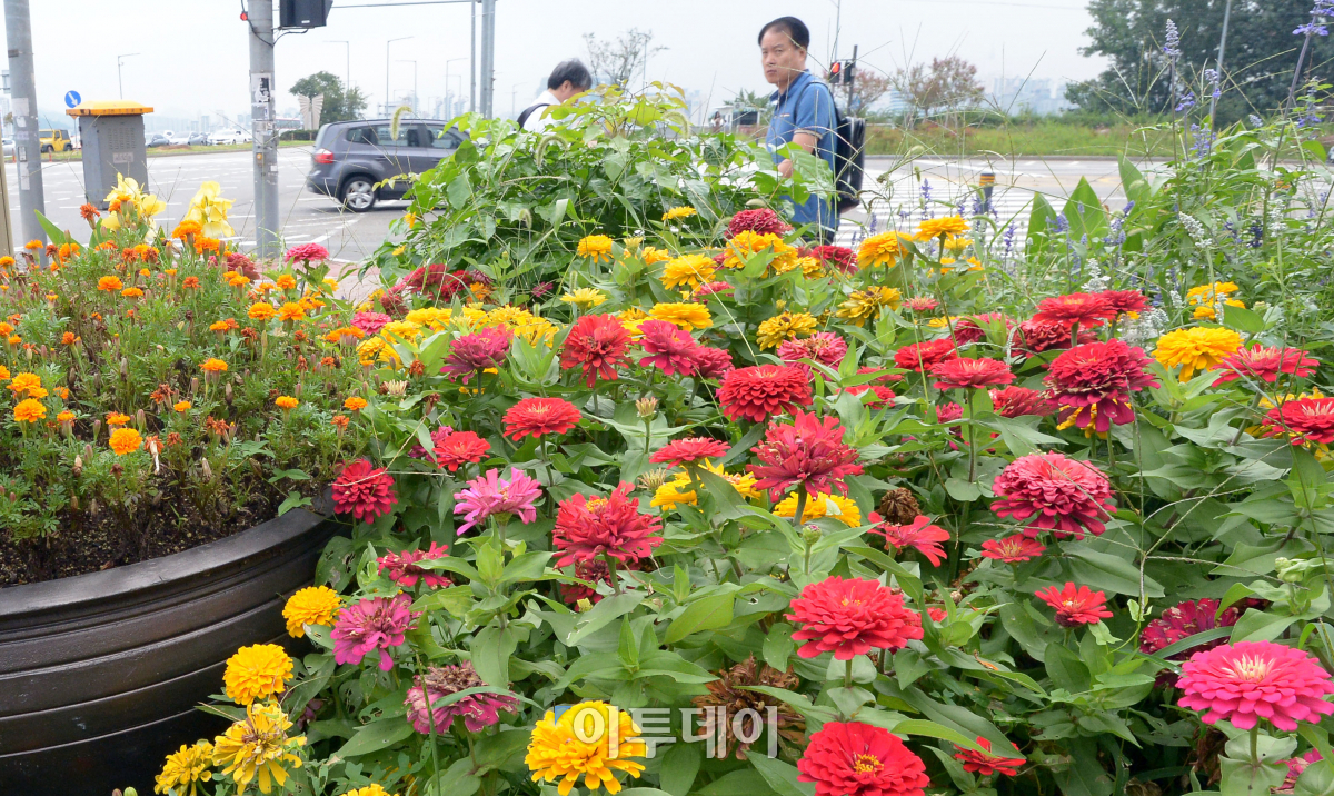 절기상 백로인 7일 오전 서울 여의도 마포대교 인근에 화려한 색상을 뽐내며 피어난 금송화 등 가을꽃들이 시민들의 이목을 끌고 있다. 기상청은 전국이 대체로 흐린후 낮부터 차차 맑아지겠으나 남해안과 제주도는 오전까지 10~40mm의 비가 오겠다고 밝혔다. 이동근 기자 foto@