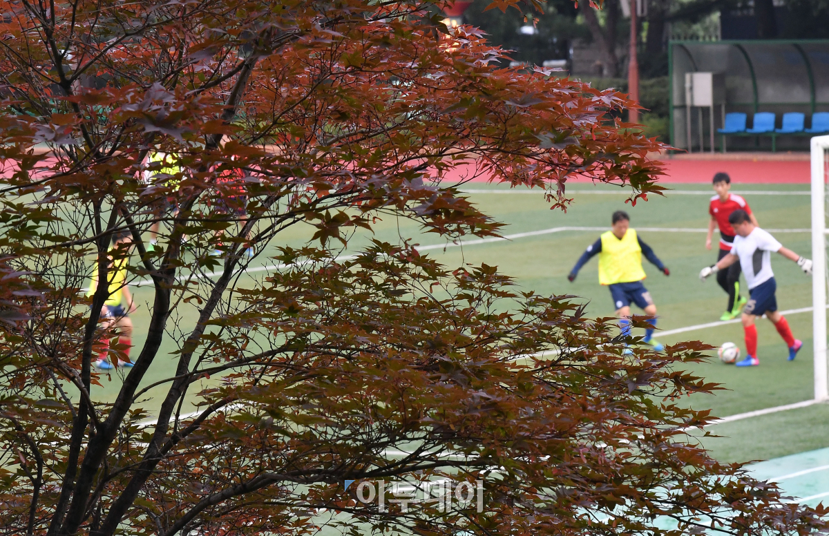 절기상 백로인 7일 서울 여의도 국회 운동장에 빨갛게 물들어가는 단풍 뒤로 시민들이 아침 운동을 하고 있다. 기상청은 전국이 대체로 흐린후 낮부터 차차 맑아지겠으나 남해안과 제주도는 오전까지 10~40mm의 비가 오겠다고 밝혔다. 이동근 기자 foto@