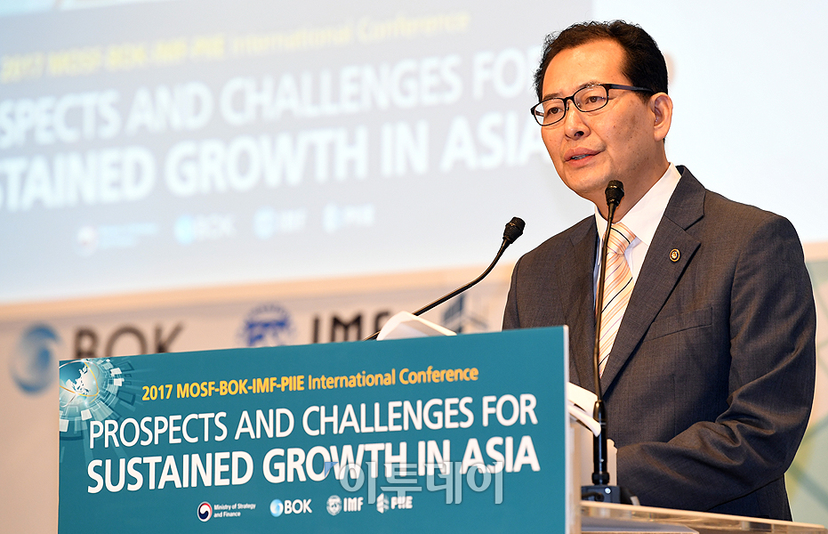 7일 서울 새문안로 포시즌스호텔에서 열린 ‘2017년 기획재정부-한국은행-IMF- 피터슨연구소 국제 컨퍼런스'에서 고형권 기획재정부 1차관이 환영사를 하고 있다. 고이란 기자 photoeran@