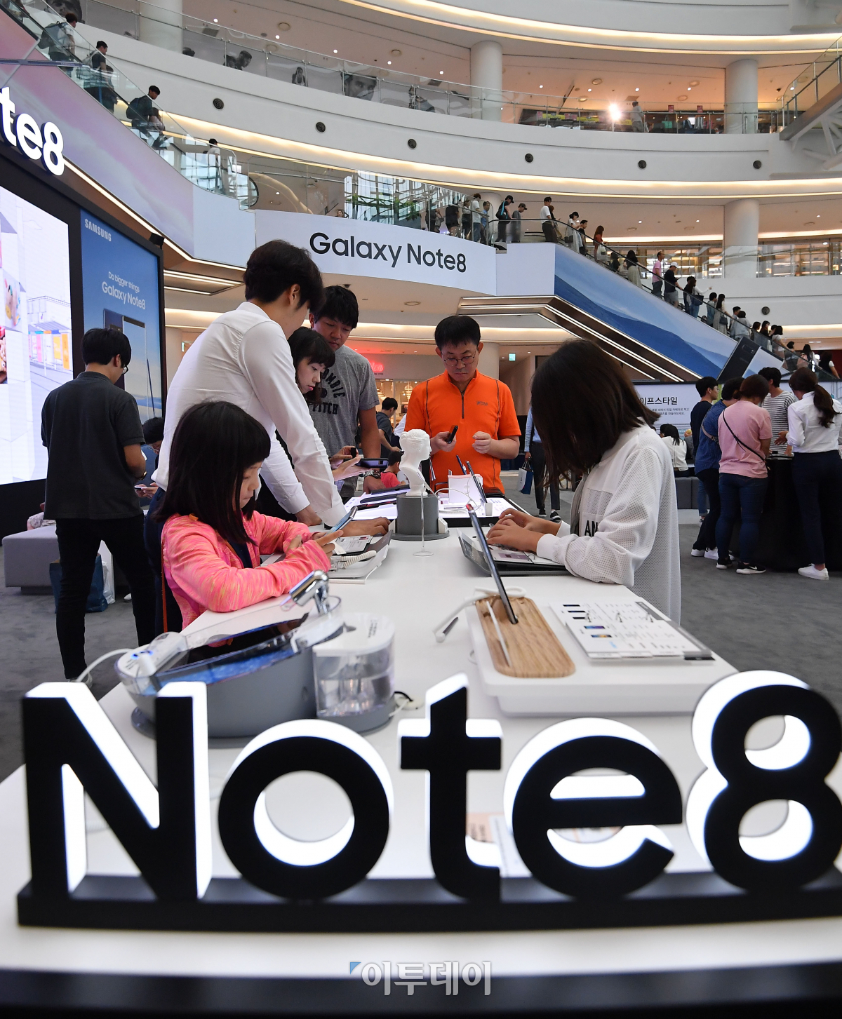 갤럭시노트8이 사전예약 첫 날 총 39만 5,000대를 판매하며 흥행조짐을 보이고 있다. 10일 서울 영등포구 타임스퀘어에 마련된 갤럭시노트8 체험존을 찾은 시민들이 제품 체험을 하고 있다. 노트8은 전체 사전판매 기간이 8일로 전작보다 짧지만 초반 열기가 이어진다면 사전 주문량이 100만 대에 이를 것이란 전망도 나오고 있다. 이동근 기자 foto@