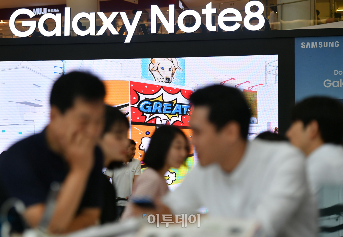 갤럭시노트8이 사전예약 첫 날 총 39만 5,000대를 판매하며 흥행조짐을 보이고 있다. 10일 서울 영등포구 타임스퀘어에 마련된 갤럭시노트8 체험존을 찾은 시민들이 제품 체험을 하고 있다. 노트8은 전체 사전판매 기간이 8일로 전작보다 짧지만 초반 열기가 이어진다면 사전 주문량이 100만 대에 이를 것이란 전망도 나오고 있다. 이동근 기자 foto@