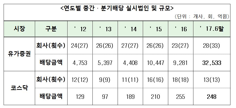 11일 금융감독원에 따르면 상반기 중간·분기 배당을 실시한 유가증권시장 상장법인은 28사로, 총 3조 2533억 원의 배당을 실시했다. 이는 2013년 4753억 원에 비해 6.8배, 지난해 상반기 9281억 원에 비해 3.5배 증가한 수준이다.