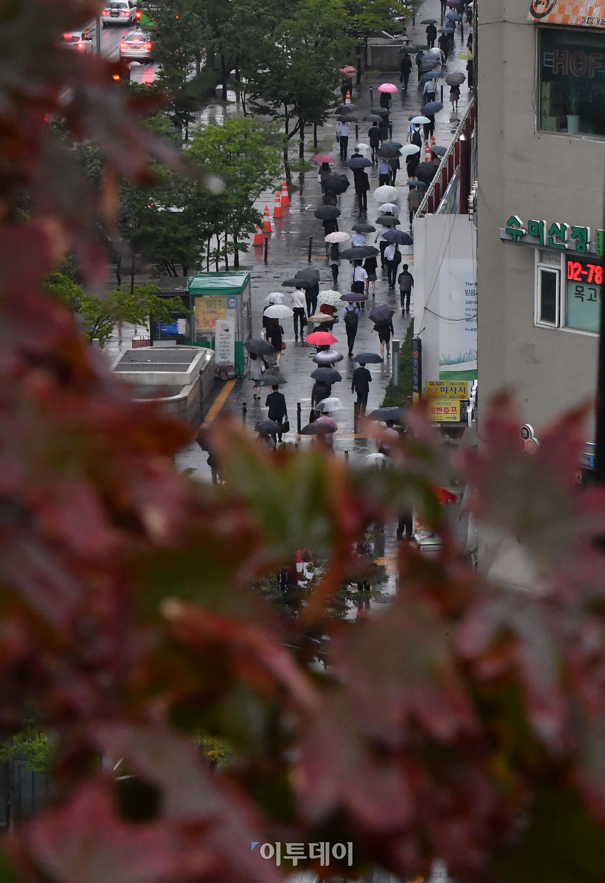 전국적으로 가을비가 내린 11일 오전 서울 여의도역 인근에서 붉게 물들어 가는 단풍 너머로 시민들이 우산을 쓴 채 출근길을 재촉하고 있다. 기상청은 전국이 흐리고 비가 오다가 낮에 서쪽지방을 시작으로 저녁에는 대부분 그칠 것으로 예보했다. 이동근 기자 foto@